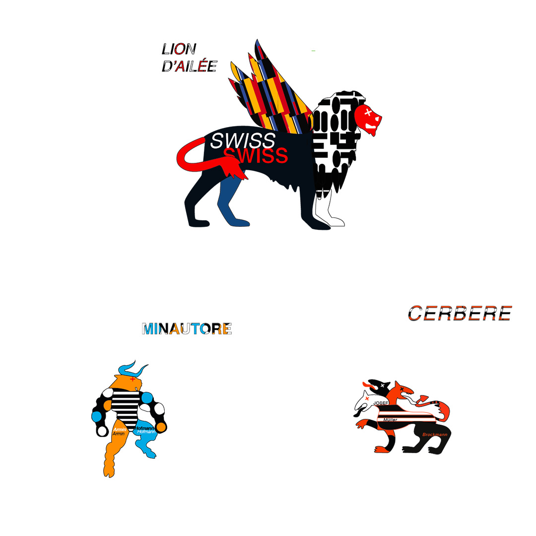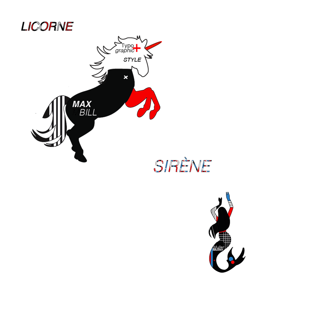 Illustration de 5 animaux de légendes dans un mouvement graphique « Le style typographique international suisses «